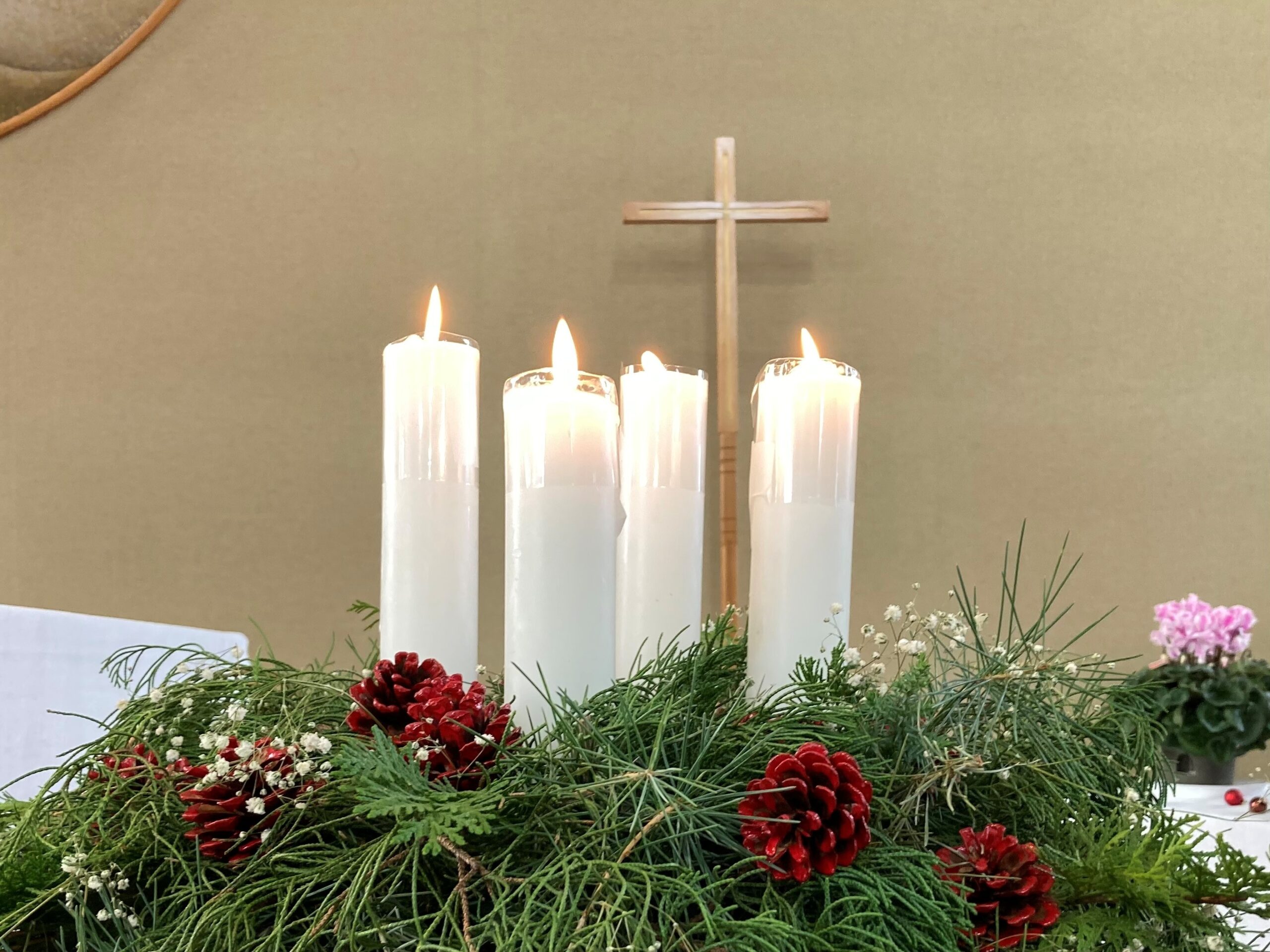 待降節の間、1本ずつ光が増えてきたアドベントキャンドル(待降節の4本のろうそく)。きょう、4本目のろうそくに火がともされました。その火のように、永遠の光であるイエス様は私たちのところに来てくださり、私たちの道をいつも照らしてくださいます。イエス様の無償の愛が、わたしたちとわたしたちの大切な人たち、すべての人に降り注いでいます。